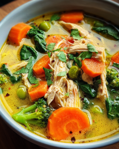 sich zu einem harmonischen Geschmackserlebnis. Die goldgelbe Farbe der Kurkuma-Hühnersuppe